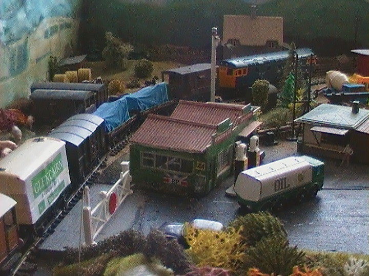 Image Description: | Train just left the fiddle yard and passing Pedgeon's Garage. |