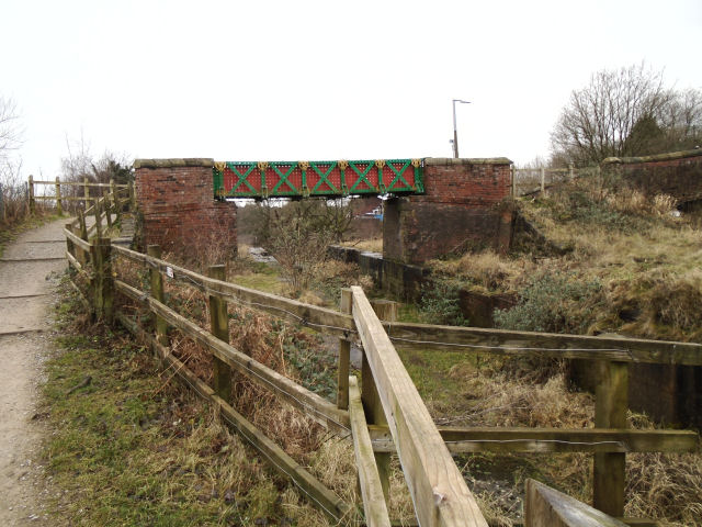 Image Description: | Meccano Bridge Giant Meccano Bridge. At Nob End, Little Lever, Bolton. The Bridge was designed to be an artistic but useful feature. It replaces a simple wooden bridge which allowed boatmen and horses to cross the top chamber of the Prestolee flight of locks on the Manchester, Bury and Bolton Canal, where the towpath changes sides |
