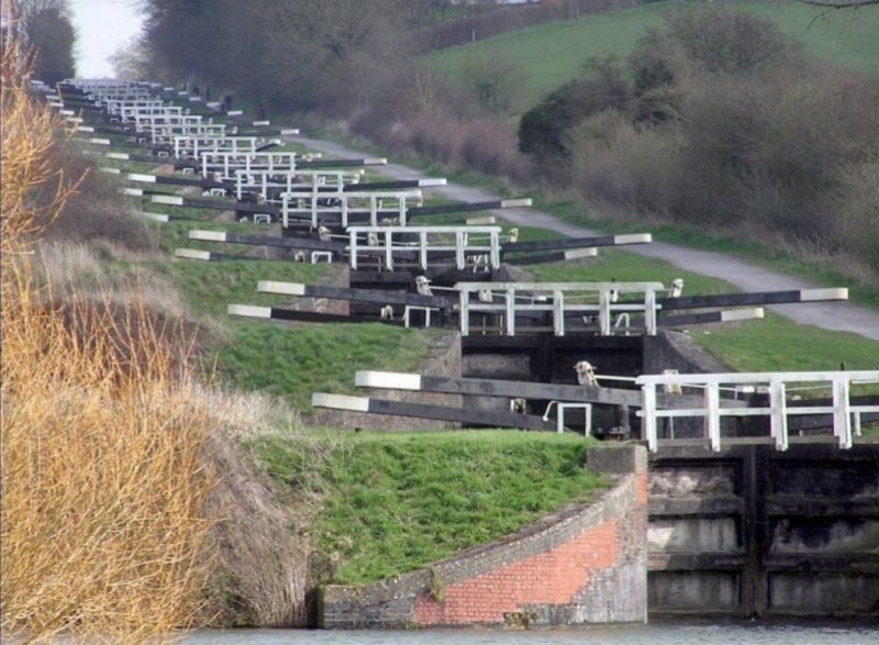 Image Description: | Caen Hill Lock Flight on the Kennet and Avon canal is a flight of 16 successive locks is one of the most impressive on the UK's waterways and forms part of the Devizes flight of 29 locks. |